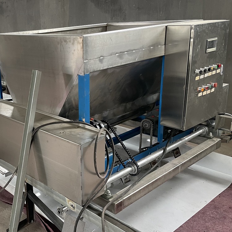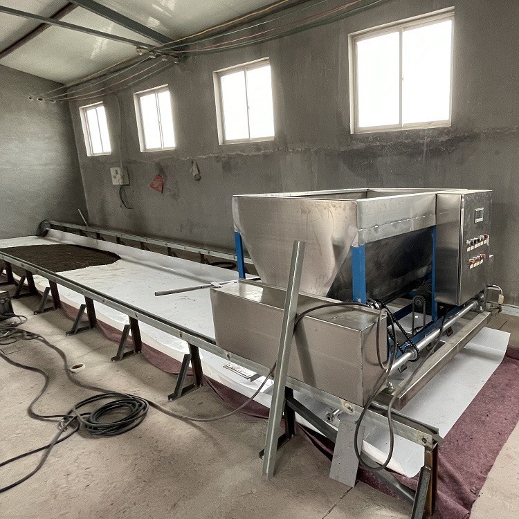 Fixed to the breeding pool by rail. driven by electric power, moving evenly forward and throwing food at a uniform speed